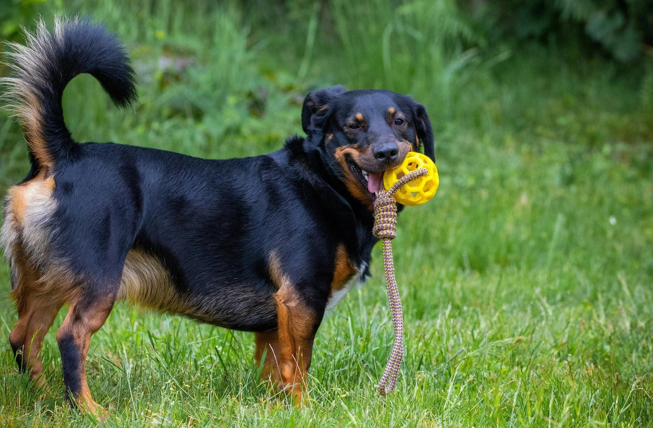 Black and tan dog with rope ball toy in his mouth. Photo by Christoph Sixt: https://www.pexels.com/photo/a-dog-playing-outdoors-with-a-toy-7766297/